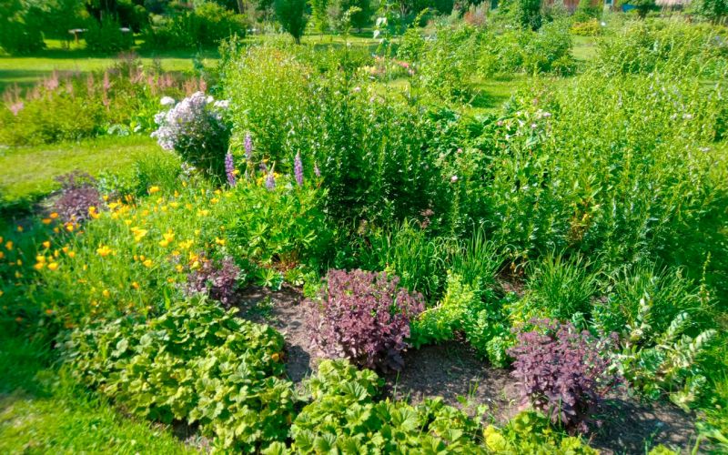 В экспозициях много лекарственных, пряных трав. А вот и луковая клумба. Для каждого вида отдельная секция. Но вот таблички есть не везде. Растения стоят мощные. Некоторые виды уже отцвели (шнитт, косой, Шуберта), некоторые в процессе (голубой, алтайский), некоторые только готовятся (слизун, душистый).