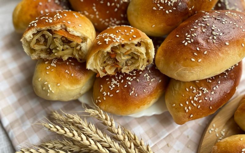 Тесто на теплом молочке подходит быстро, раз при этом обминаем. Раскатываем формируя порционно колобки, делая при этом лепёшку укладываем начинку. Защипываем края. Укладываем на смазанный маслом противень швом вниз. Смазываем пирожки сверху смесью (яйцо+молоко), посыпаем семенами кунжута. Даём расстояться минут 10-15, при этом разогреваем духовку. Ставим в горячую духовку 180 °С около 20 мин. У всех духовка разная, посматривайте за пирожками. Как зарумянятся, так и готовы. Приятного чаепития!