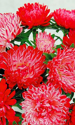 Великолепная смесь окрасок высокорослых, обильноцветущих астр, с крупными, густомахровыми соцветиями. Кусты широкораскидистые, прочные, высотой 60-70 см. Соцветия-корзинки полусферические, почти шаровидные, похожи на пионовидные, разнообразных окрасок. Декоративная...