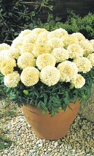 Однолетнее растение, высотой до 30 см. Многочисленные махровые лимонно-желтые соцветия, рассыпанные по яркой зелени, будут радовать Вас на протяжении всего лета. Бархатцы великолепно смотрятся в цветниках, группами на газонах, рабатках и в контейнерной...