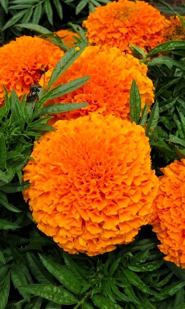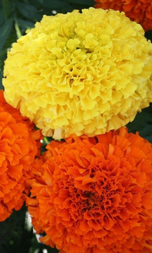 Обильное и продолжительное цветение. Растение высотой до 90 см. Цветки собраны в крупные, махровые и шарообразные соцветия - корзинки, диаметром до 10 см, жёлтой и оранжевой окраски. Цветет с июня до заморозков. Чтобы продлить цветение, необходимо удалять увядшие цветки...