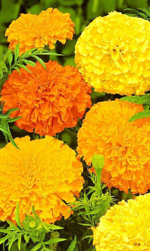 ОднолетнееВеликолепные крупные махровые соцветия. Куст компактный, высотой до 90 см. Побеги прочные, ребристые, светло-зелёные. Созвездия гвоздиковидные, полушаровидные, 8-10 см в диаментре, оранжевые, жёлтые, золотистые. Цветет с июля по октябрь. Используются для клумб, рабаток, высоких групп, на срезку. Растение теплолюбивое, засухоустойчивое.