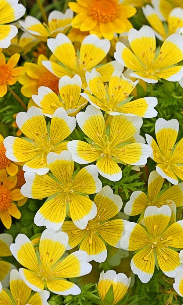 Лимнантес - прелестное однолетнее карликовое растение, высотой до 20см, образует плотный стелющийся ковер. Цветки до 2,5см, каждый цветочек состоит из пяти лепестков, жёлтый у основания, с белоснежной широкой каймой. Из-за этого цветочки похожи на мини яичницу, за что...