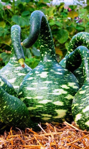 Удивительное, редкое растение. Уникальный сорт с изогнутыми плодами. Представляет собой лиану с крупными округлыми, бархатистыми листьями. Вызревшие плоды с затвердевшей корой неограниченно долго хранятся при комнатной температуре, используются для поделок...