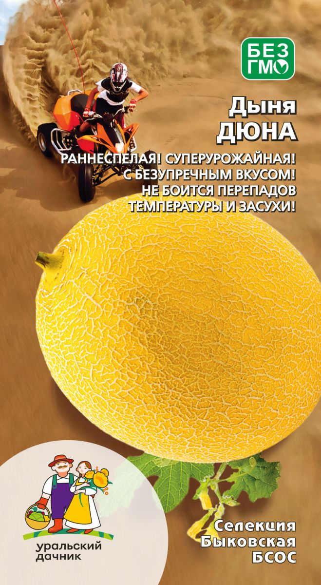 Высокоурожайный, раннеспелый сорт для выращивания в плёночных теплицах и в открытом грунте. Вегетационный период 58–65 дней. Плоды овальной формы, жёлтые, с тонкой сеткой средней плотности, массой 2,5–4,5 кг. Мякоть белая, толстая и плотная, зернистая, нежная, тающая, очень сладкая и ароматная.