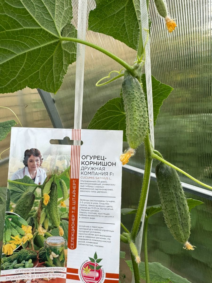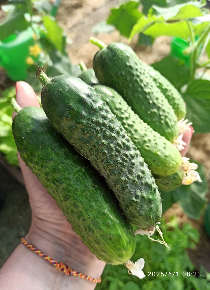 Ультраранний (35 дней), высокоурожайный, универсальный гибрид с хорошо выраженной партенокарпией, женского типа цветения. Зеленцы расположены пучками. 2-3 штуки в узле. Плод без горечи, тёмно-зелёного цвета, длиной до 11-13 см. бугорчатые, с белыми шипами. Мякоть плотная, хрустящая. Гибрид великолепен в засоле и в свежем виде.