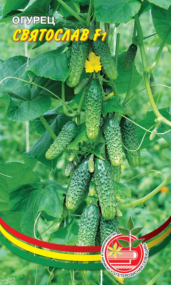 Зеленцы этого гибрида в засолке напоминают по вкусу огурцы старинных русских бочковых засолов. Гибрид Святослав отличается отменной урожайностью, простым уходом. По срокам созревания – раннеспелый. В опылении насекомыми не нуждается, выращивается и под укрытиями, и на грядах. Под открытым небом даёт отличные урожаи красивых и вкусных зеленцов. Плоды достигают длины до 8-9 см, имеют небольшую ребристость. Отличается очень высокой стойкостью к мучнистой и ложной мучнистой росе...