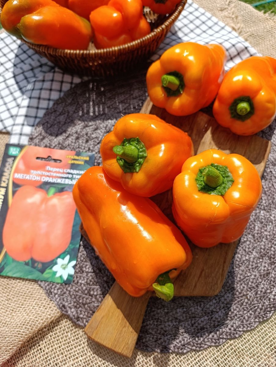 Гибрид раннего срока созревания. Для выращивания в теплицах, парниках, туннелях. Растение высокорослое (80-85 см), мощное. Плоды гибрида Мегатон F1 сразу выделяется на общем фоне, плоды его величественно висят по периметру куста крупными ровными тяжёлыми крупными кубами, гладкие, глянцевые. Плоды одни из самых крупных среди цветных перцев, вес их колеблется от 260 до 300 г (!), толщина стенки от 0,8 до 1 см(!), мякоть брызжуще-сочная, необыкновенно вкусная и ароматная. В собранном вами урожае плоды перца будут «равны как на подбор» – один к одному крупные, толстостенные, вкусные и полезные.