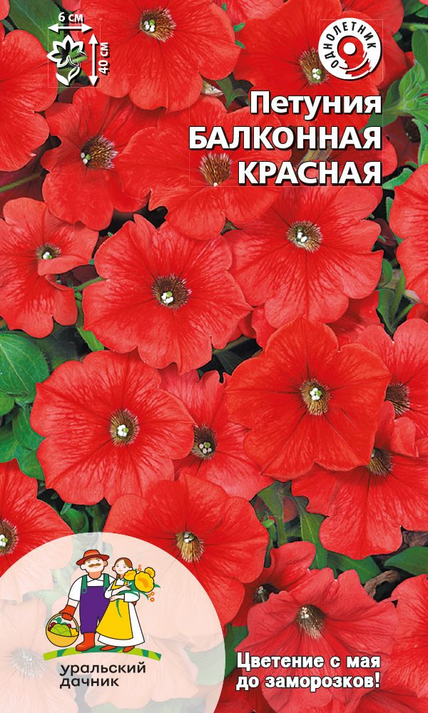 Ампельная обильноцветущая петуния. Стебли свисающие, гибкие, длиной 35-40 см, равномерно усыпаны огромным количеством красных цветков Ø6-8 см. Цветение раннее и продолжительное, с мая до окончания сезона. Растения прочные, хорошо переносят воздействие дождя и ветра, не...