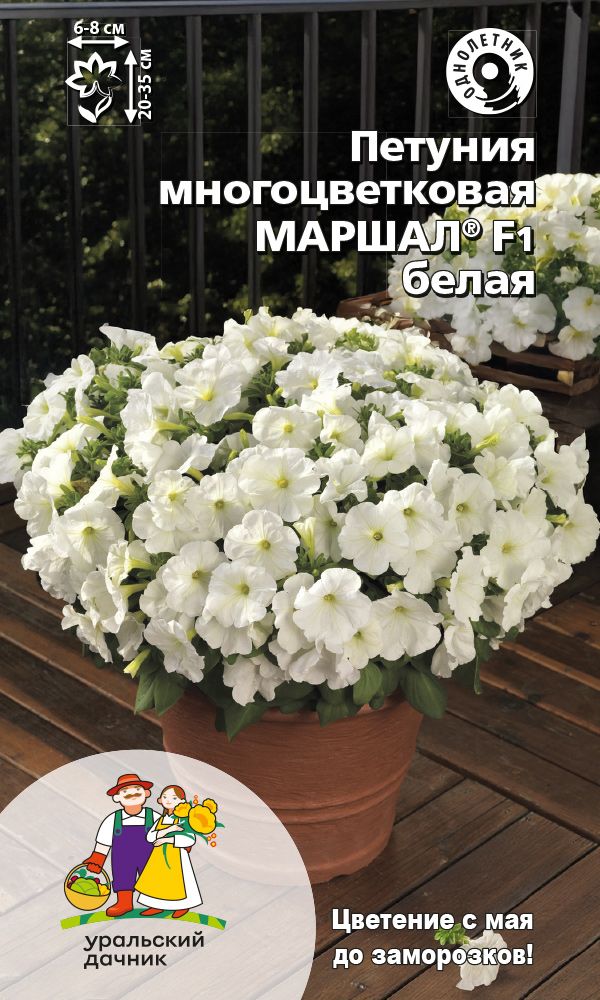 Красивые крупные чисто-белые цветы украшают плотный кустик высотой около 30 см. Используют в клумбах для ярких групп, на бордюрах, рабатках, в подвесных корзинках.Посев на рассаду в феврале-апреле поверхностно – семена слегка вдавливают в почву, землёй не присыпают, под...