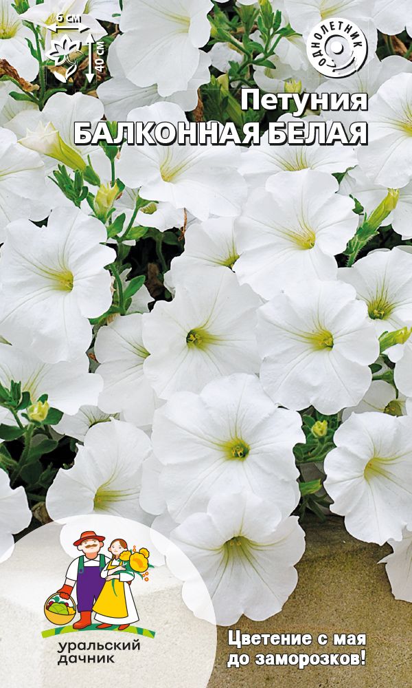 ОднолетнееАмпельная обильноцветущая петуния. Стебли свисающие, гибкие, длиной 35-40 см, равномерно усыпаны огромным количеством белоснежных цветков Ø6-8 см. Цветение раннее и продолжительное, с мая до окончания сезона. Растения прочные, хорошо переносят воздействие дождя и ветра, не теряя своей декоративности. Петуния светолюбива, засухоустойчива, хорошо адаптируется к любым условиям выращивания. Идеально подходит для выращивания в подвесных корзинах, кашпо и балконных ящиках.