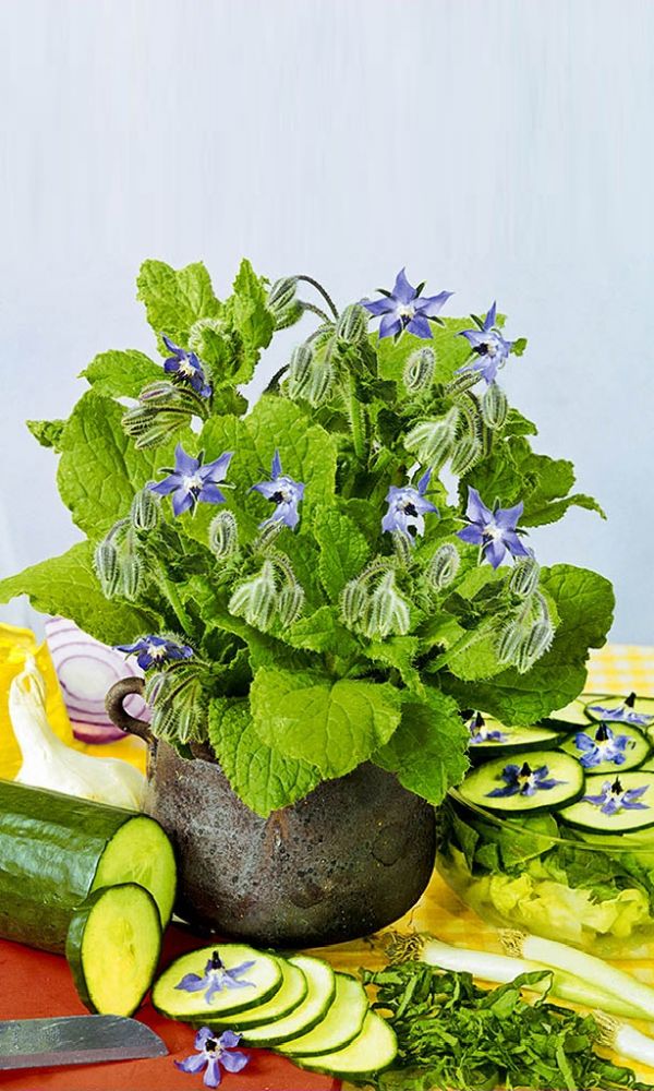 ОднолетнееОднолетнее растение с приятным запахом свежего огурца. Период от полных всходов до уборки на зелень 40-50 дней. Рекомендуется для использования молодых побегов, листьев и цветков в свежем и сушёном виде в качестве приправы к овощным блюдам, при консервировании и засолке. Содержит большое количество полезных веществ. Растение раскидистое с интенсивным ветвлением. Розетка листьев горизонтальная, диаметром 20 см, высотой до 40 см. Лист среднего размера, сидячий, тёмно-зелёный, со слабым восковым налётом, продолговатой формы, слабоморщинистый. Цветок голубой. Молодые листья с мягким опушением. Масса одного растения 100 г. Урожайность зелёной массы 1 кг/м2.