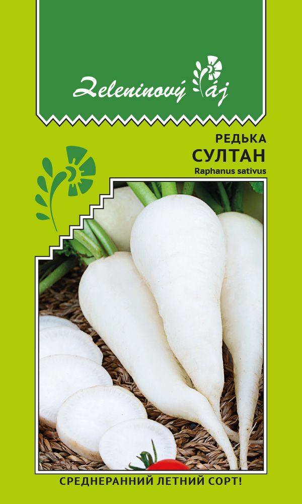 Среднеспелый (80-85 дней) сорт. Корнеплоды овальные или округло-овальные, тёмно-зелёные с белым кончиком, массой 250-300 г. Мякоть светло-зелёная, сочная, нежная, хрустящая, без характерной для редьки сильной горечи, по вкусу приближается к редису. Высокая товарность корнеплодов. Пригоден к длительному хранению. Рекомендуется для употребления в свежем виде...