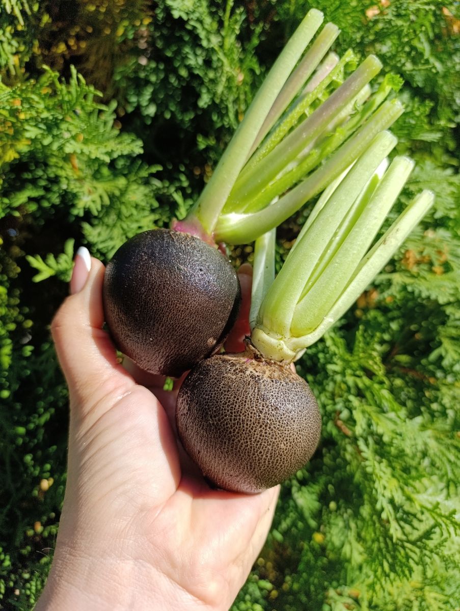 Высокоурожайный, среднеспелый, зимний сорт. Корнеплоды округлые, чёрные, массой 250-300 г, с белой, сочной, вкусной мякотью, слабоострого вкуса.