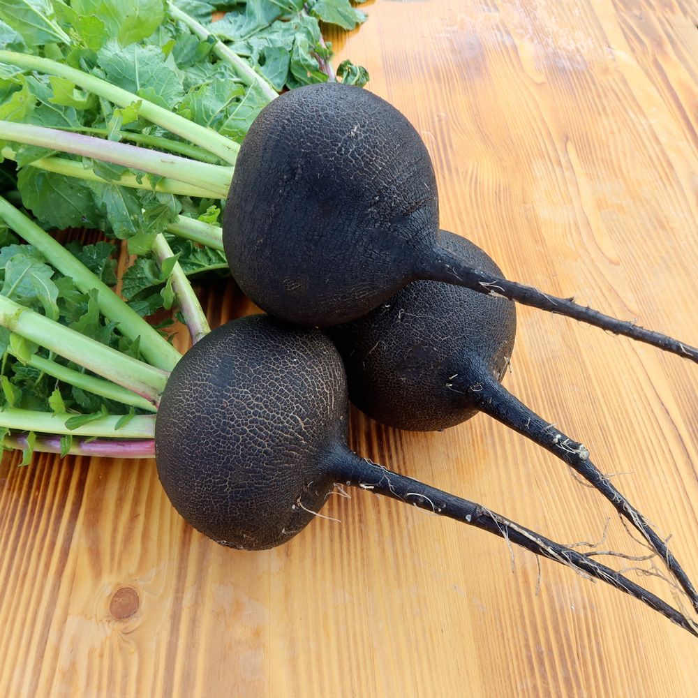 Среднеспелый сорт. Период от всходов до уборки урожая 70-95 дней. Розетка полураскидистая. Корнеплод чёрный, округлый, длиной 8-12 см, диаметром 9-13 см. Поверхность слегка бороздчатая. Мякоть белая, плотная, сочная, остро-сладкого вкуса. Масса до 300 г. В почву погружён полностью, легко выдергивается. Отлично хранится.