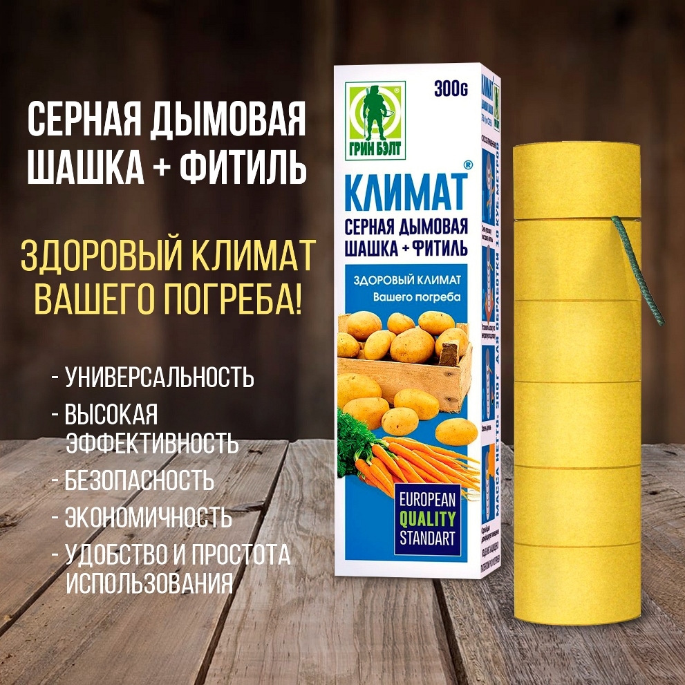 КЛИМАТ cерная дымовая шашка – эффективное средство для уничтожения возбудителей болезней, бактериальных инфекций, плесени, грибков, насекомых, клещей в пустых подвалах, овощехранилищах, парниках, теплицах.