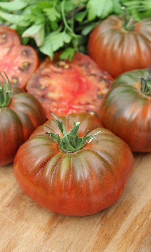Крупные коричневатые очень вкусные плоды! Среднеспелый сорт для плёночных теплиц. Плоды плоскоокруглой формы ребристые, масса 140-160 г, отличного вкуса. Оригинальная окраска плодов от тёмно-красного до чёрного цвета. Сорт устойчив к альтернариозной пятнистости листьев, кладоспориозу, вирусу табачной мозаики. Салатное использование...