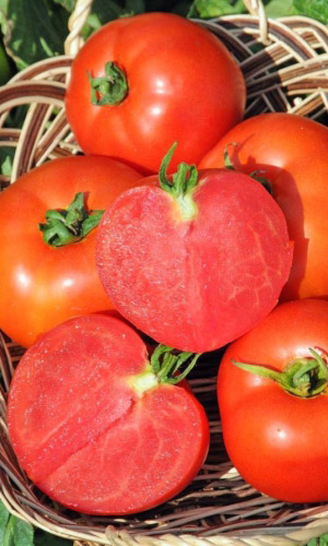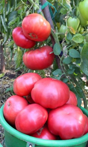 Суперурожайный, раннеспелый, крупноплодный сорт для теплиц и парников. Плоды сердцевидной формы, насыщенно-малинового цвета, массой 200-250 г (отдельные до 700 г), мясистые, сочные, ароматные, потрясающего вкуса.Ценность сорта: высокая и стабильная урожайность, стрессоустойчивость, устойчивость к вирусу табачной мозаики, вершинной и корневой гнили, альтернариозу. Рекомендуется для употребления в свежем виде, приготовления соков, томатных соусов и пасты, засолки и консервирования...