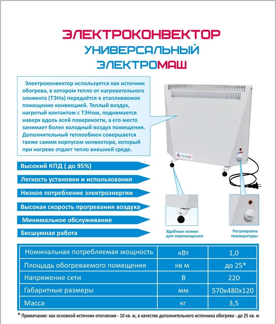 Электроконвектор используется как источник обогрева, в котором тепло от нагревательного элемента (ТЭНа) передаётся в отапливаемое помещение конвекцией. Тёплый воздух, нагретый контактом с ТЭНом, поднимается наверх вдоль всей поверхности, а его место занимает более холодный воздух помещения. Дополнительный теплообмен совершается также самим корпусом конвектора, который при нагреве отдаёт тепло внешней среде. Постоянное движение воздуха позволяет создать комфортную температуру в помещении.