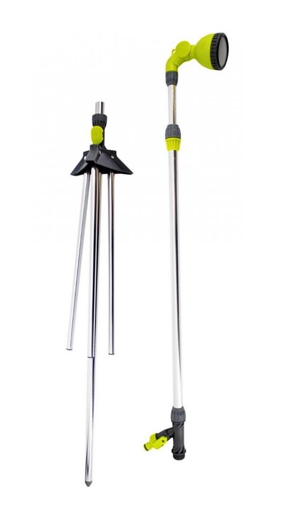 Прост и удобен в эксплуатации. Душ оснащён регулируемой поворотной насадкой-распылителем, регулятором тока воды. Тренога обеспечивает устойчивость конструкции как на ровной поверхности, так и в грунте. Телескопическая металлическая стойка регулируется по высоте от 165 до 220 см. Материал: алюминий, пластик повышенной прочности...