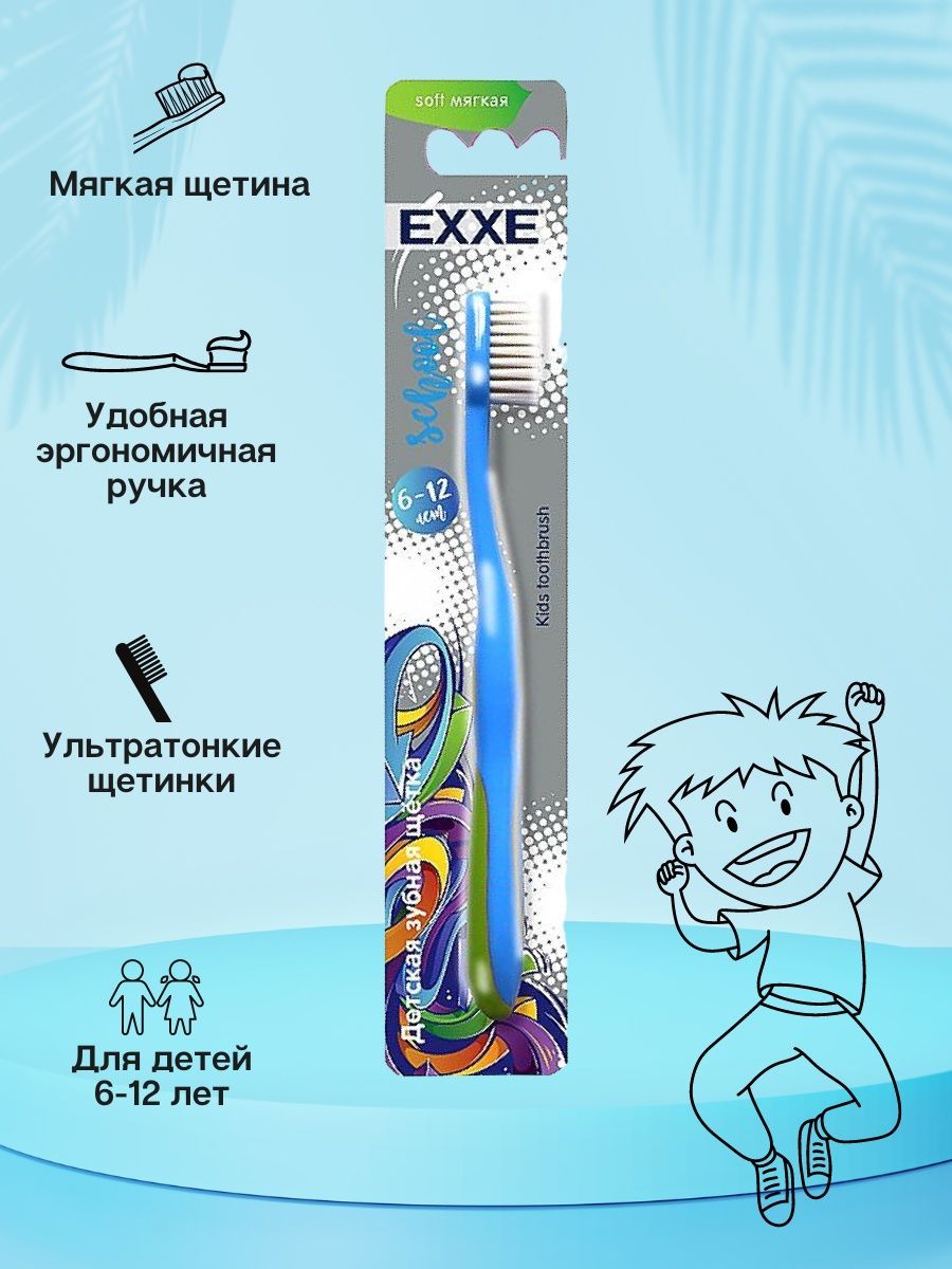 Зубная щётка мягкая для детей EXXE School. Особые мягкие и ультратонкие щетинки деликатно и бережно воздействуют на зубную эмаль, не травмируя поверхность зубов. Удобный изгиб ручки позволяет легко и без дополнительного давления на дёсны очистить дальние поверхности. Полированные щетинки имеют идеальную скругленную форму, что с одной стороны, позволяет добиться более высокого очищающего эффекта, а с другой – деликатно и бережно воздействуют на зубную эмаль, не травмируя поверхность зубов.